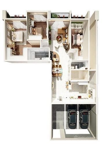 - Thiết kế căn hộ đẹp độc lạ có gara trước nhà để được 2 xe ô tô và nhiều xe máy, hiện đại, thuận tiện di chuyển