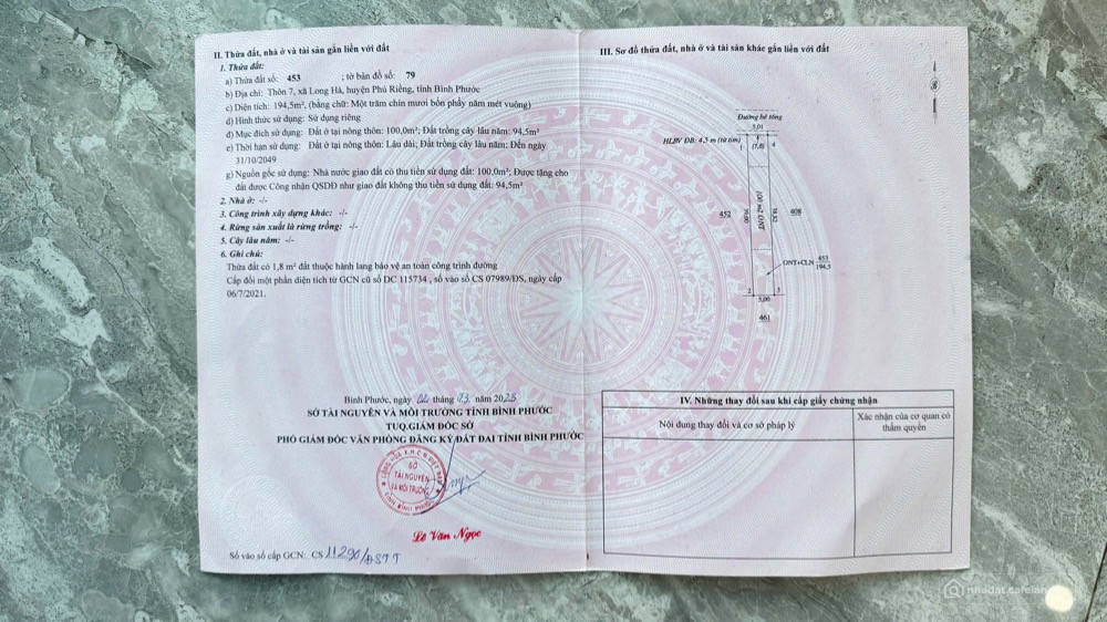 SIÊU CƠ HỘI ĐẦU TƯ – SỞ HỮU ĐẤT SỔ HỒNG NGAY TẦM TAY Vị trí vàng – Ngay trung tâm KHU CÔNG NGHIỆP LONG HÀ, PHÚ RIỀNG – BÌNH PHƯỚC (thuộc vùng quy hoạch TỈNH ĐỒNG NAI MỚI) — Cơ hội hiếm có dành cho nhà đầu tư thông minh, đón đầu làn sóng dịch chuyển đầu tư & quy hoạch hạ tầng 2025–2030! Địa chỉ: Thôn 7, xã Long Hà, huyện Phú Riềng, tỉnh Bình Phước Diện tích: 194,5 m² (100 m² thổ cư + 94,5 m² trồng cây lâu năm) Pháp lý: SỔ HỒNG RIÊNG, sang tên ngay trong ngày! ️ Đường bê tông 5m trước đất – xe hơi vào tận nơi Giá bán chỉ: 390 triệu/nền Ngân hàng hỗ trợ vay lên đến 300 triệu Chỉ cần 90 triệu là cầm ngay sổ hồng trong tay