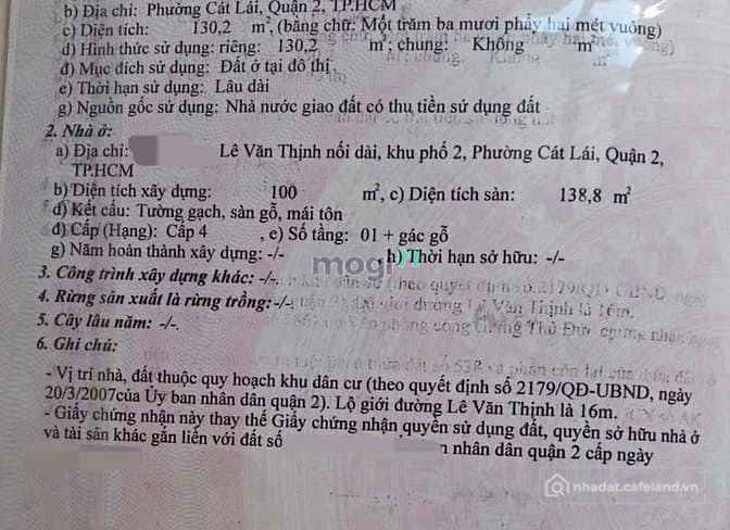 BÁN nhà cấp 4 mặt tiền đường LÊ VĂN THỊNH Quận 2