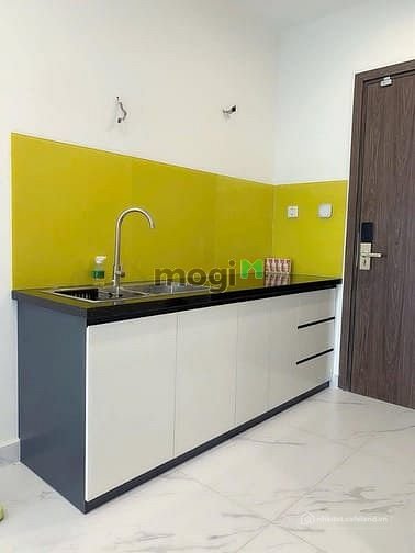 căn hộ có rèm, máy lạnh âm trần, kệ bếp, khóa vân tay, giường, nệm, máy nước nóng.