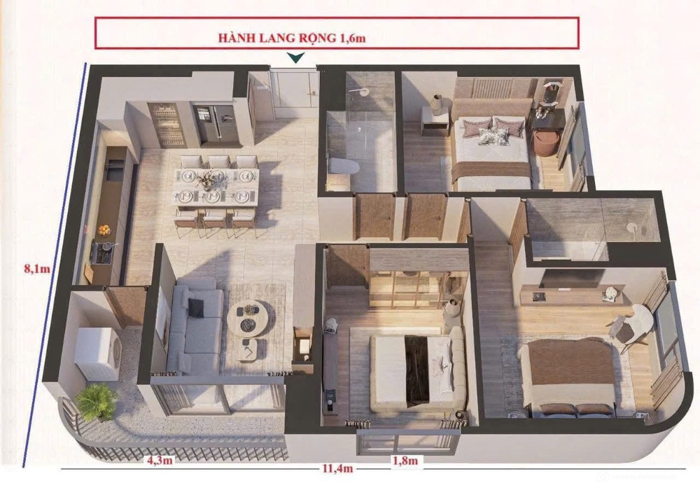 - Thiết kế 11 căn/tầng 6 thang máy, hành lang rộng 1,6 m, trần cao 3,3m.