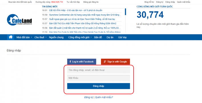 Bước 1:Đăng nhập vào hệ thống Nhà Đất CafeLand
